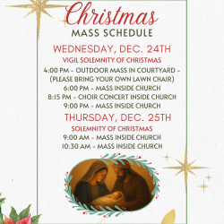 Christmas MASS SCHEDULE WEDNESDAY, DEC. 24TH VIGIL SOLEMNITY OF CHRISTMAS 4:00 PM – OUTDOOR MASS IN COURTYARD – (PLEASE BRING YOUR OWN LAWN CHAIR) 6:00 PM – MASS INSIDE CHURCH 8:15 PM – CHOIR CONCERT INSIDE CHURCH 9:00 PM – MASS INSIDE CHURCH THURSDAY, DEC. 25TH SOLEMNITY OF CHRISTMAS 9:00 AM – MASS INSIDE CHURCH[…]